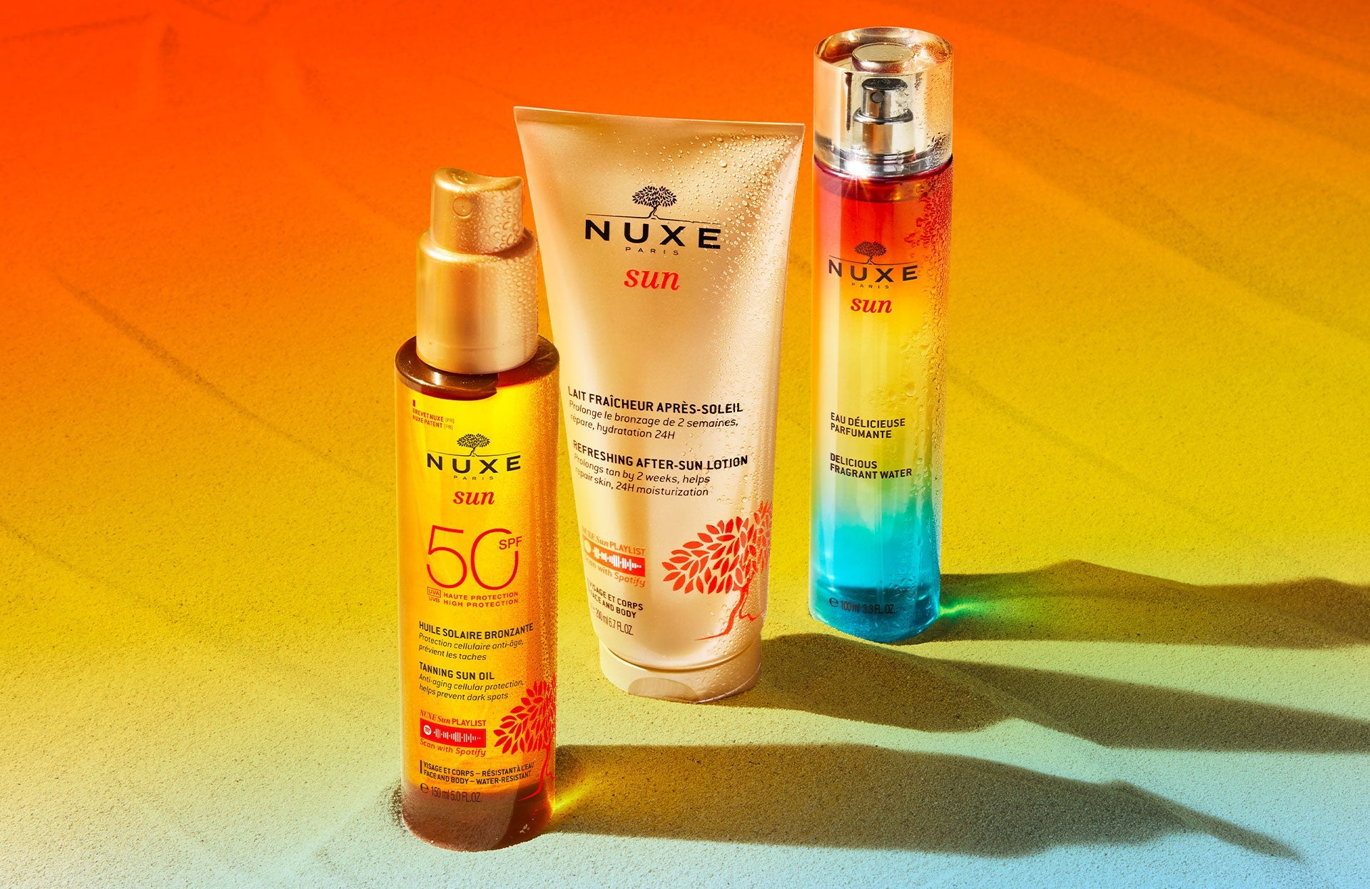 Le Laboratoire NUXE se lance dans les solaires et démontre que les protecteurs peuvent aussi être glamour. NUXE Sun se démarque avec ses textures addictives et son parfum d’évasion aux notes ensorcelantes. Les huiles solaires font sensation, tout comme le lait après-soleil : ils sont N°1 de leurs catégories ⁽⁸⁾ en pharmacie en France. L’Eau Délicieuse NUXE Sun est également le parfum le plus vendu en pharmacie ⁽⁹⁾ en France.